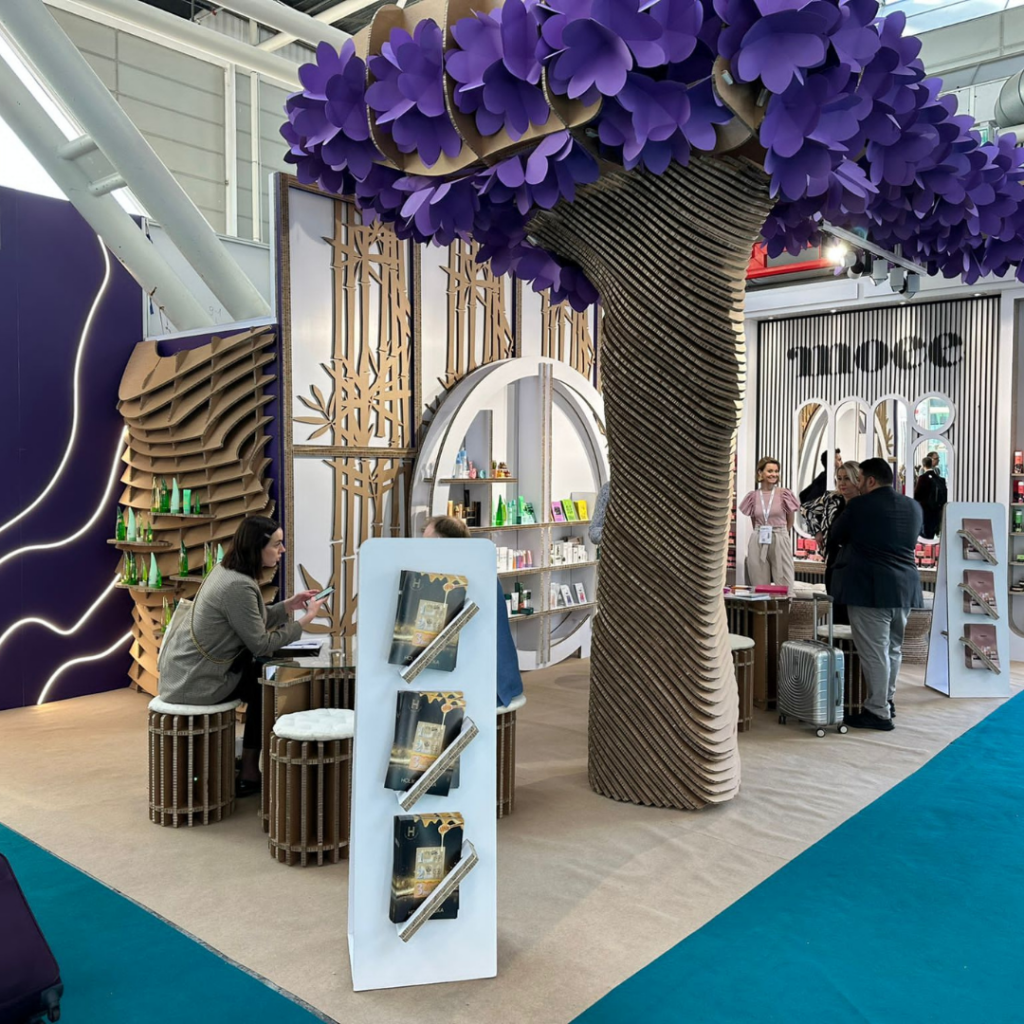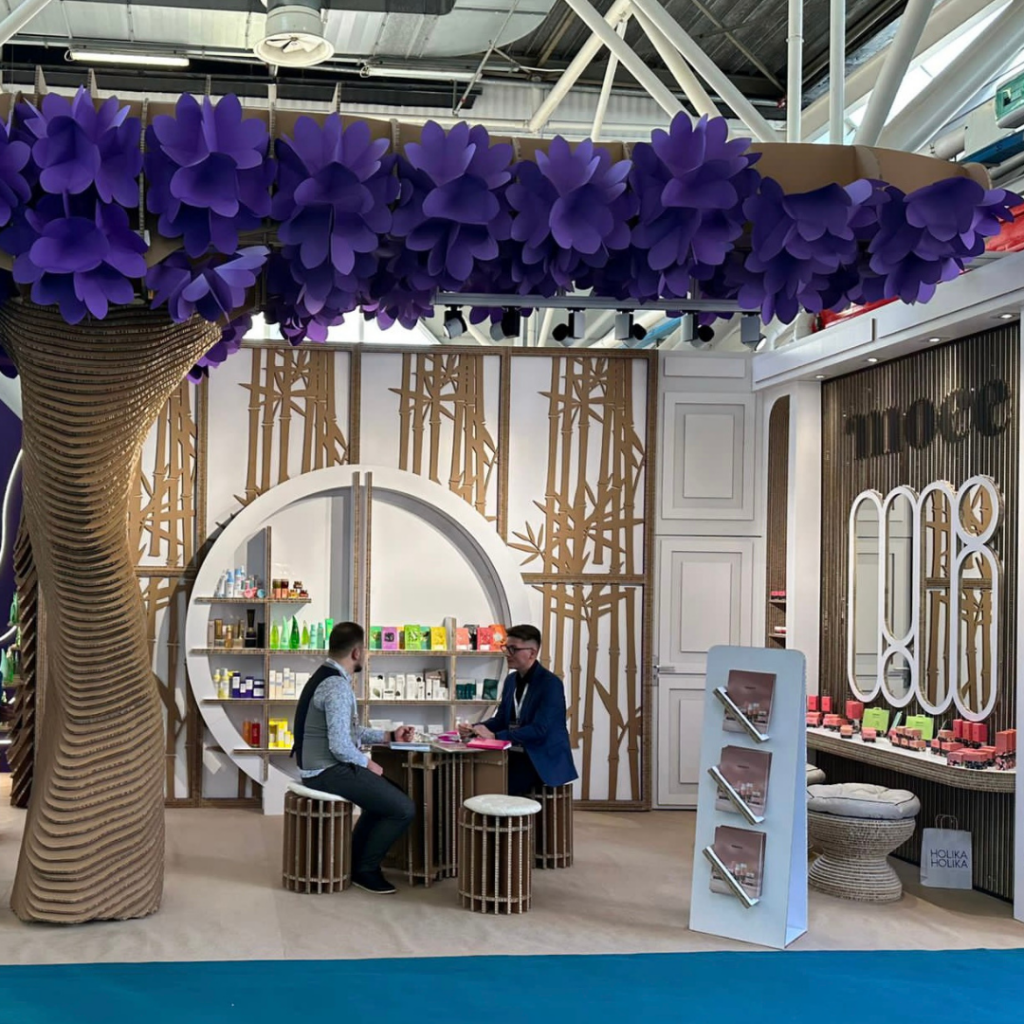 W rzeczywistości stoisko stało się prawdziwym hitem Cosmoprof 2023. Tłumy zwiedzających nie tylko z ciekawością oglądały produkty, ale masowo fotografowały się na tle tekturowego drzewa. Udowodniliśmy, że profesjonalne podejście do eko-designu potrafi wygrać z każdą plastikową konstrukcją, budując globalny zasięg marki Holika Holika.