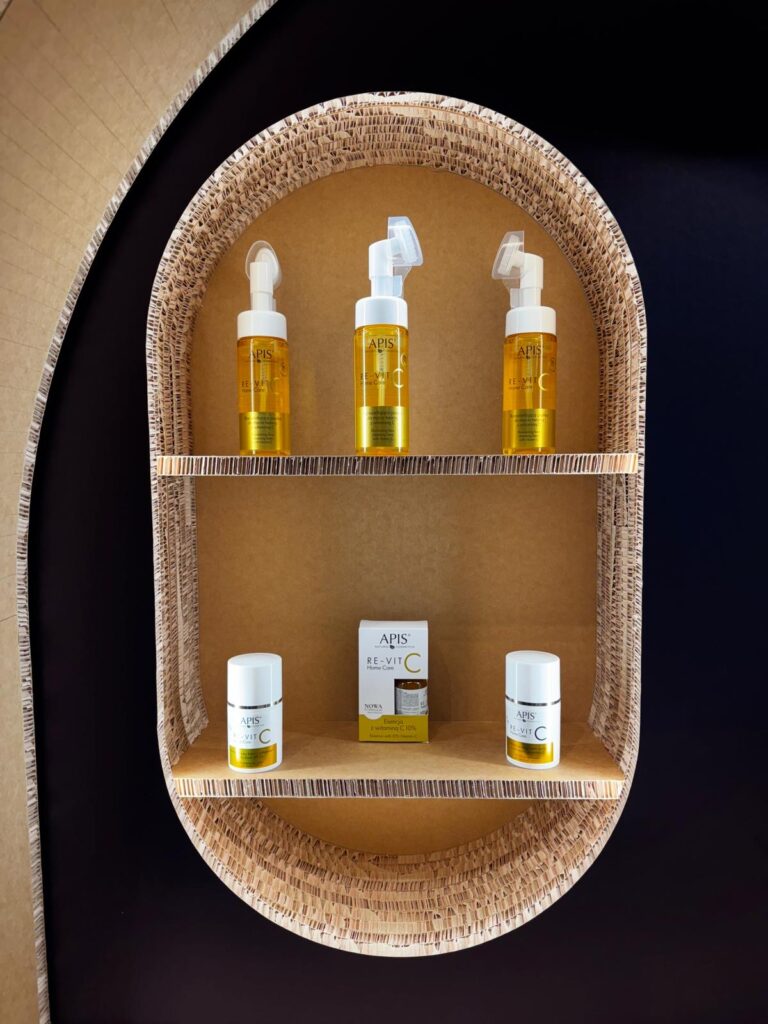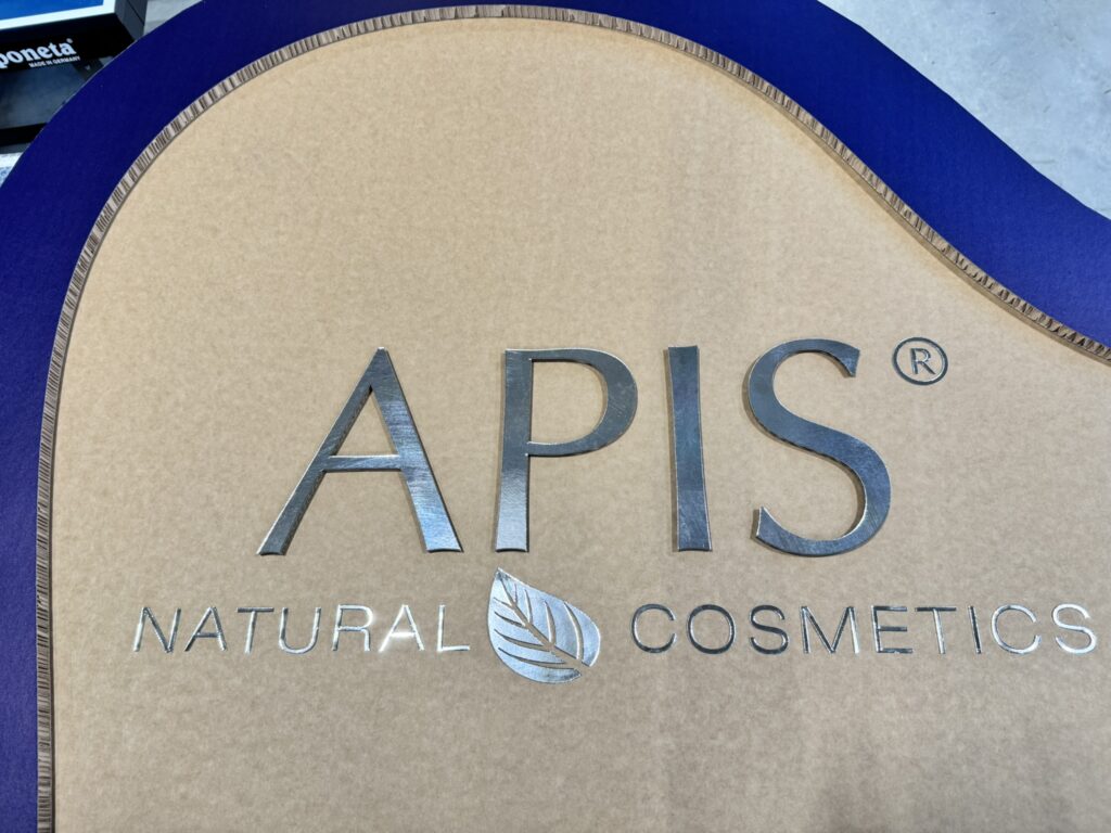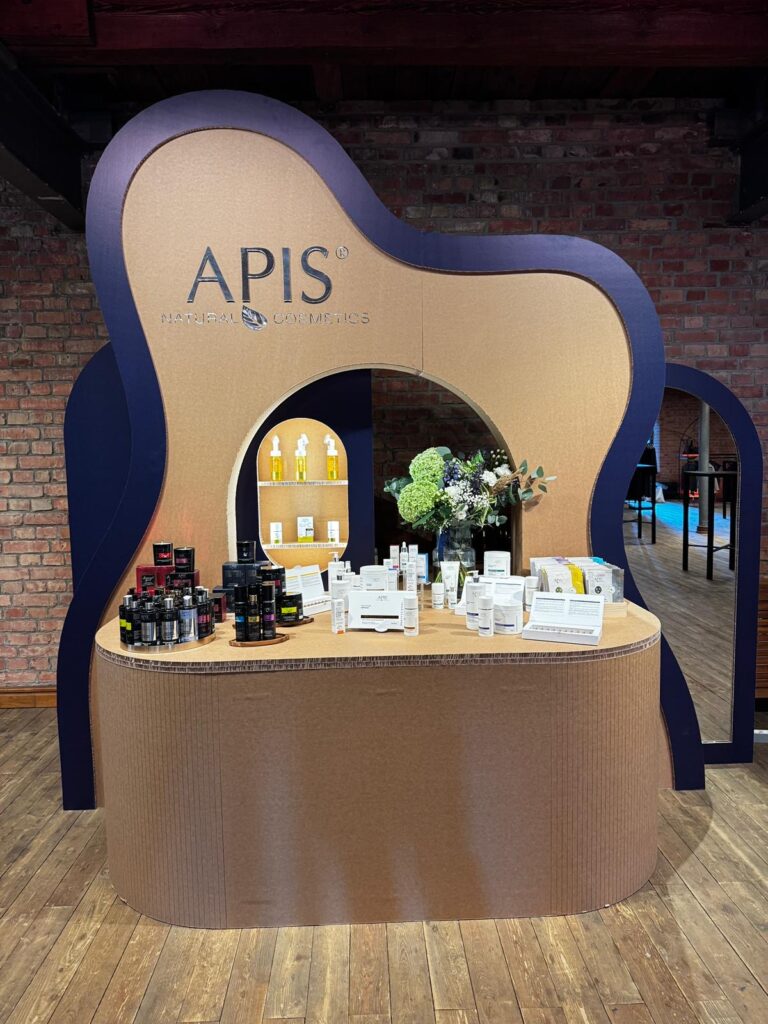 Marka Apis potrzebowała stoiska o wymiarach 3×2 m, które mimo ograniczonej przestrzeni, pozwoli na efektowną prezentację nowej linii kosmetyków. Kluczowym założeniem była dostępność stoiska z każdej strony oraz stworzenie elementu, który stanie się znakiem rozpoznawczym marki podczas wydarzenia. W tym celu stworzylismy kartonowe stoisko w kształcie łuku według wytycznych klienta.
